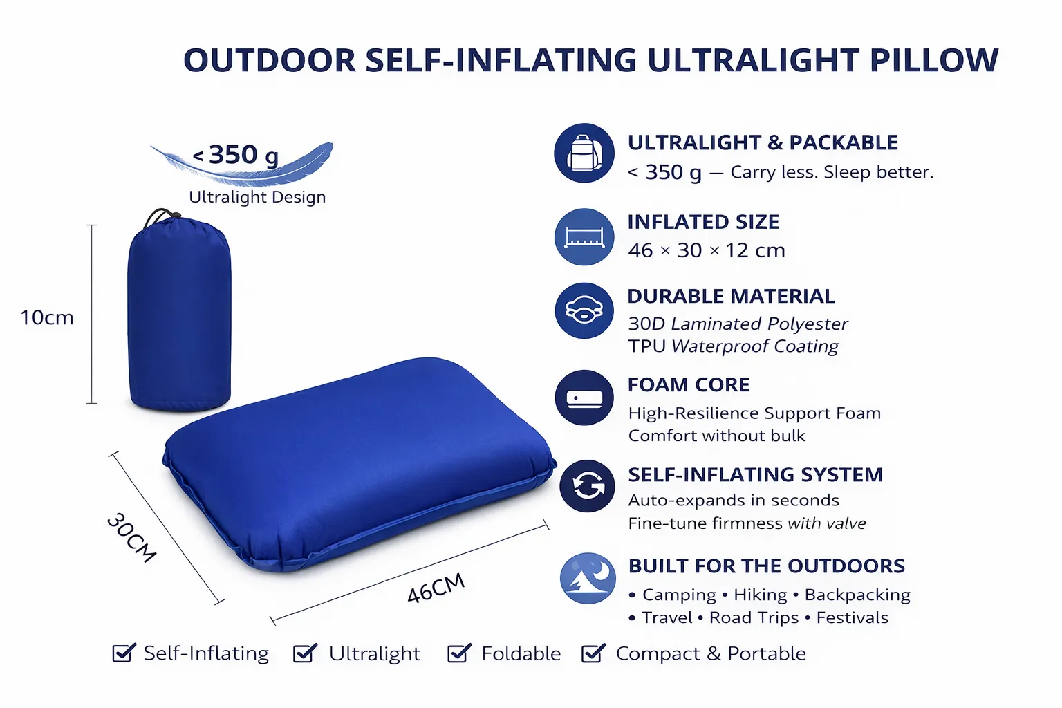 Whether you’re camping, backpacking, or traveling long distances, this pillow adapts to your needs—providing consistent comfort on any surface.