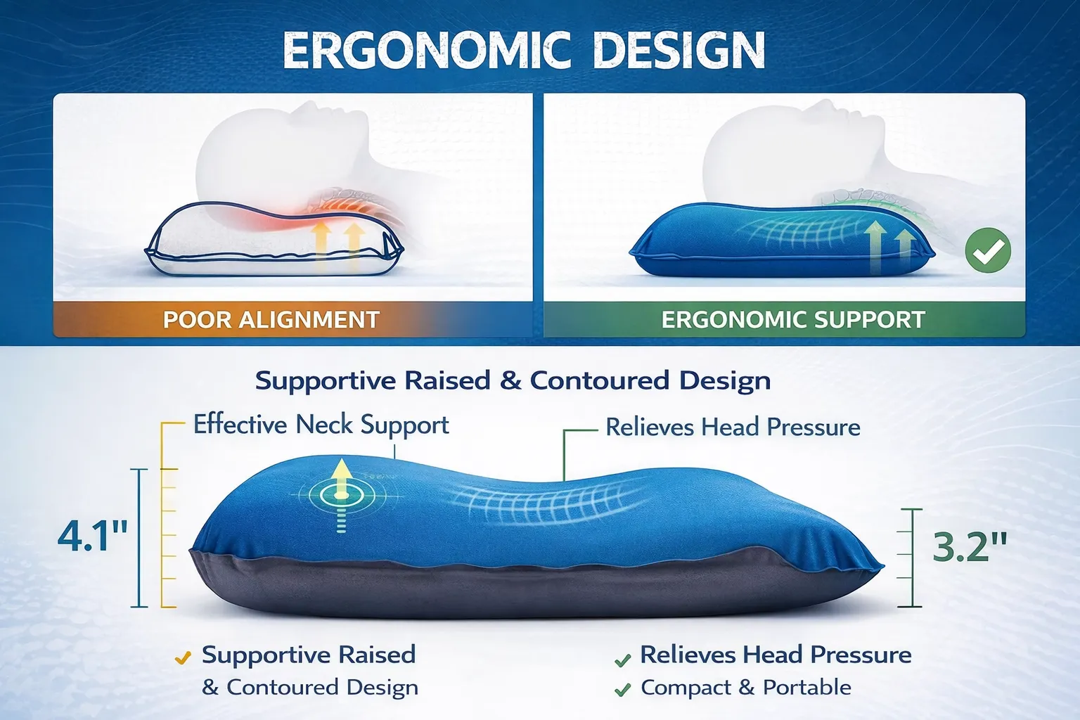 A high-density memory foam layer gently contours to your head and neck, evenly distributing pressure and reducing strain. It provides a soft, stable sleeping surface that feels closer to a home pillow than traditional inflatable designs.